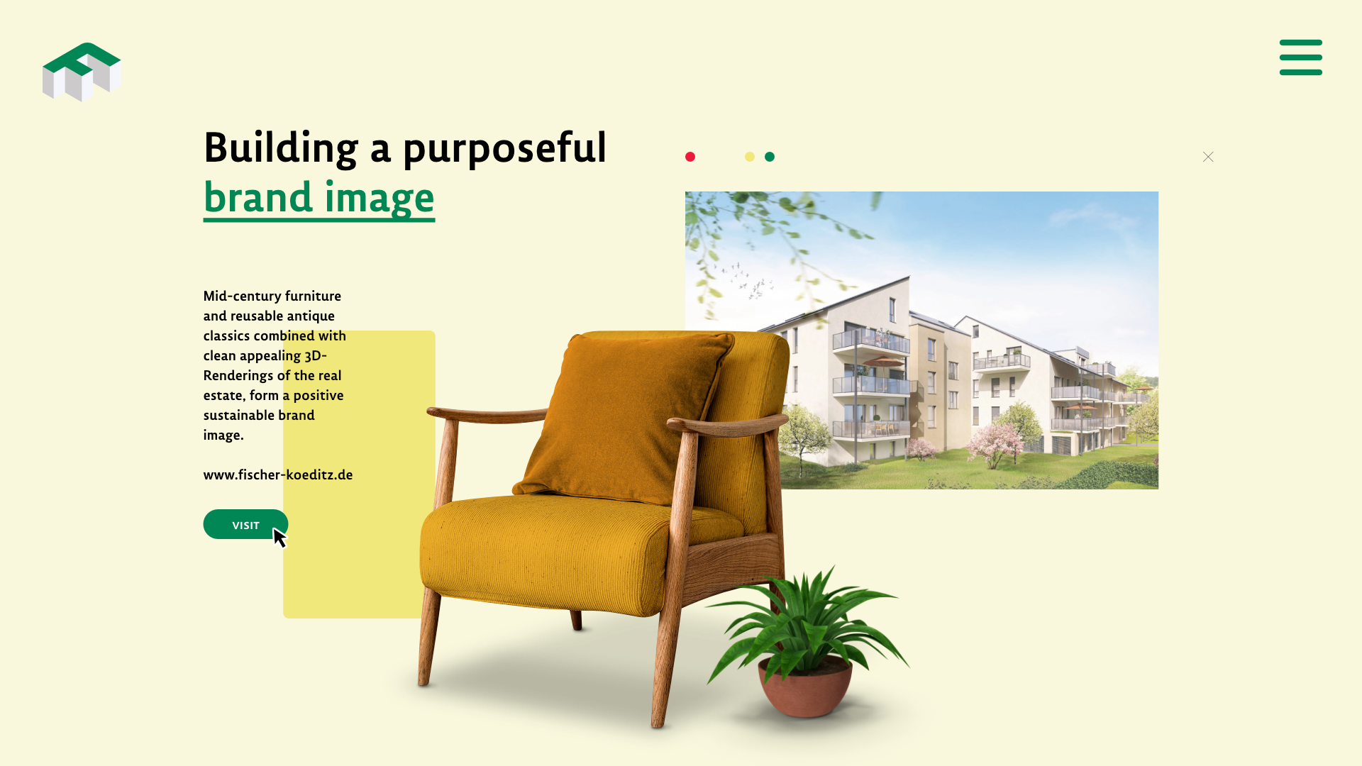 Clean appealing Imagery and Renderings combined with Mid-Century furniture and reusable antique classics form a positive sustainable brand image.